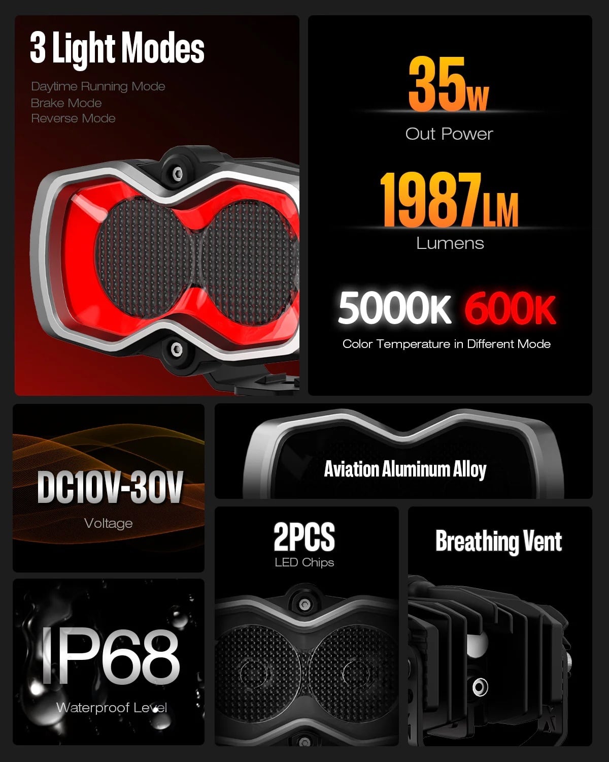 HALO4.5インチサードブレーキライトは、35Wの高出力、1,987ルーメン、そしてブレーキとバックのライトをシームレスに切り替える赤/白のデュアルカラーLEDを搭載し、オフロードでの安全性とスタイルを向上させます。