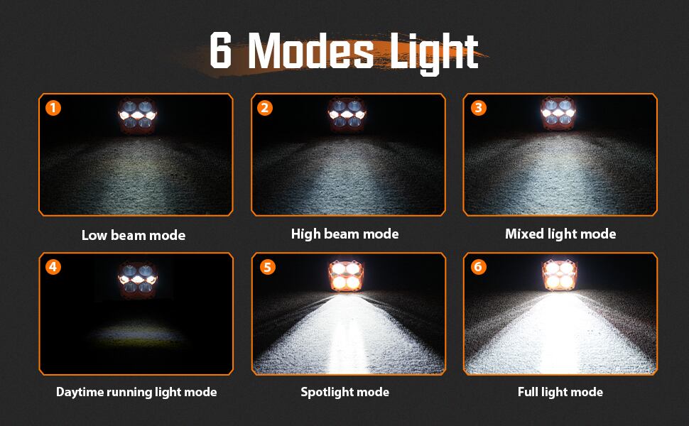 ドライビングライトモードを有効にすると、光学的に検証されたレンズと組み合わせると、最大幅80フィート、距離500フィートの照明範囲を提供できます。また、ロービーム、ハイビーム、混合モードを切り替えることで、さまざまな地形の照明ニーズに対応できます。広い照明範囲により、スポットライトモードでの近接照明の不足を補うことができます。もちろん、スポットライトとドライビング ライトを同時にオンにして、最適な光出力を実現できます。