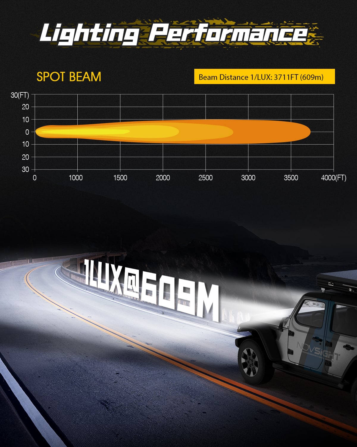 スポットライトモデルは、最大 1,752フィートの集中照明と30 フィートのビーム幅を提供します。オフロードドライバーの長距離照明と精密照明のニーズを満たします。