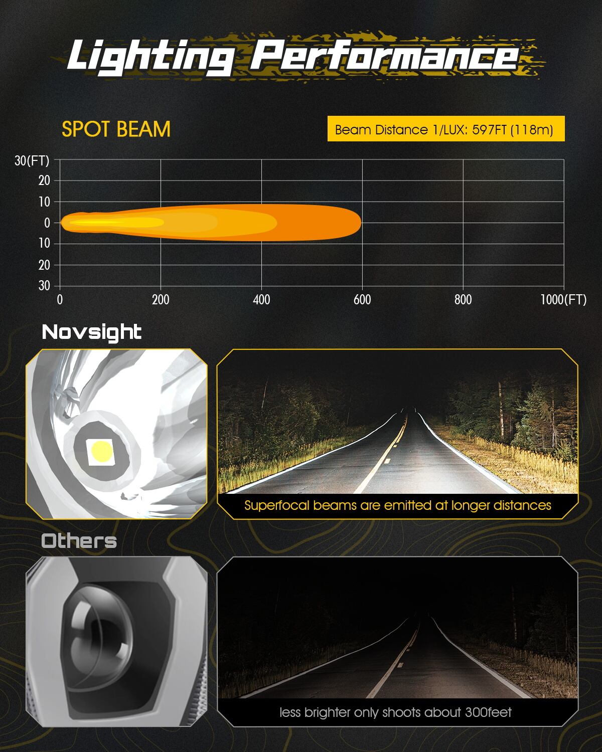 スポット ビーム:スポット モードのオフロード ライトは、ビーム幅 20 フィートで最大 597 フィートの集中照明を提供します。長距離の精密な照明のニーズに最適です。